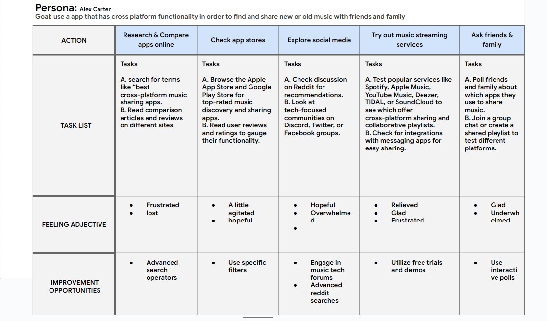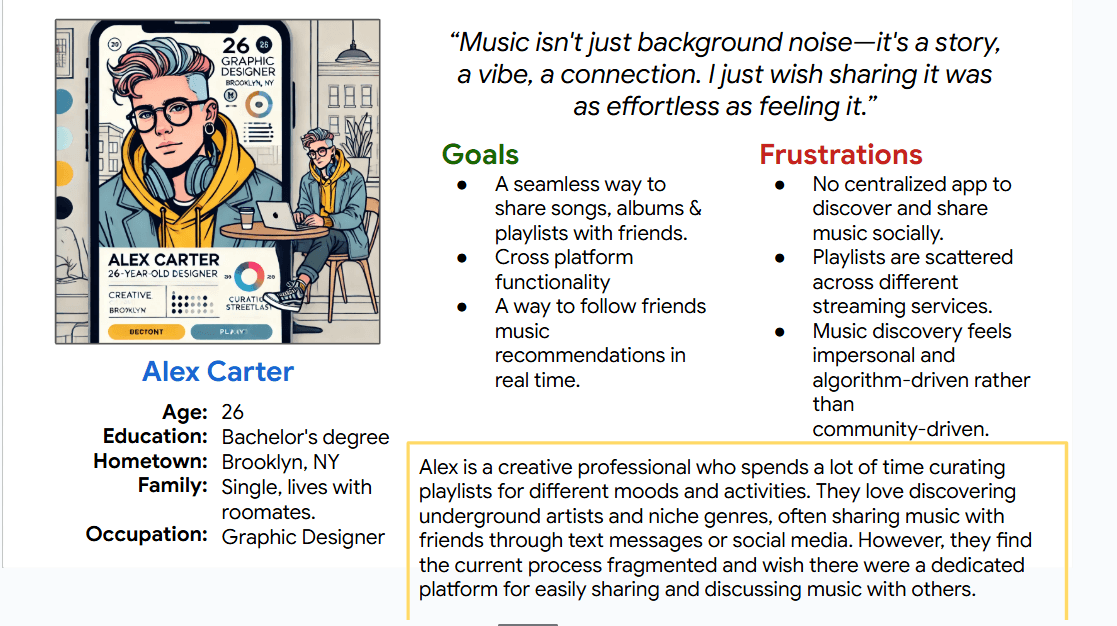 I conducted user persona research to better understand potential users for the app. This included defining user demographics, motivations, pain points, and ideal solutions based on hypothetical but realistic personas. But before conducting the research, I assumed that users primarily wanted a more social way to share and discover music. I knew that existing streaming platforms already fulfilled most sharing needs, but I thought users might want cross-platform integration too. So, after developing the personas, I found that users wanted meaningful discussions, playlist collaborations, and even a “mixtape” feel to sharing music. These discoveries helped in a major way to creating this app.